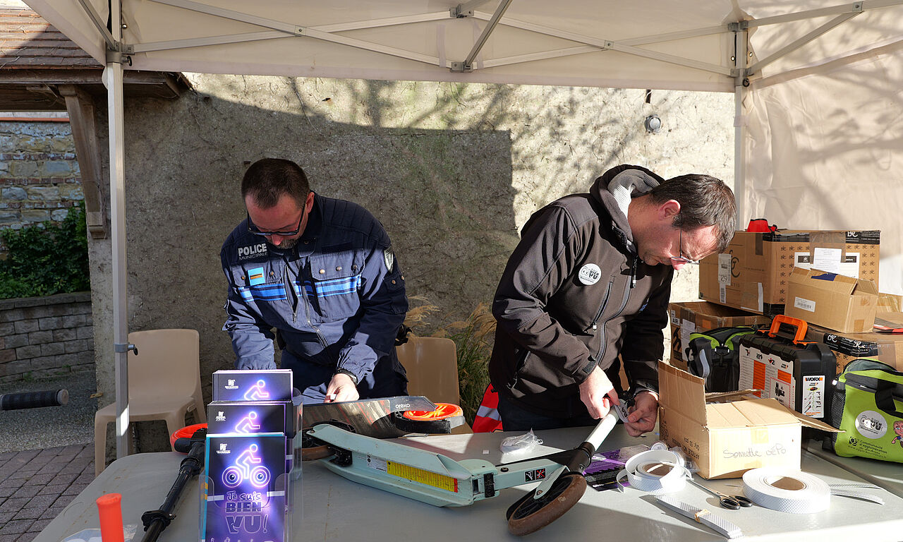 pose de bandes réfléchissantes, distribution de brassards et contrôles préventifs de l’éclairage des